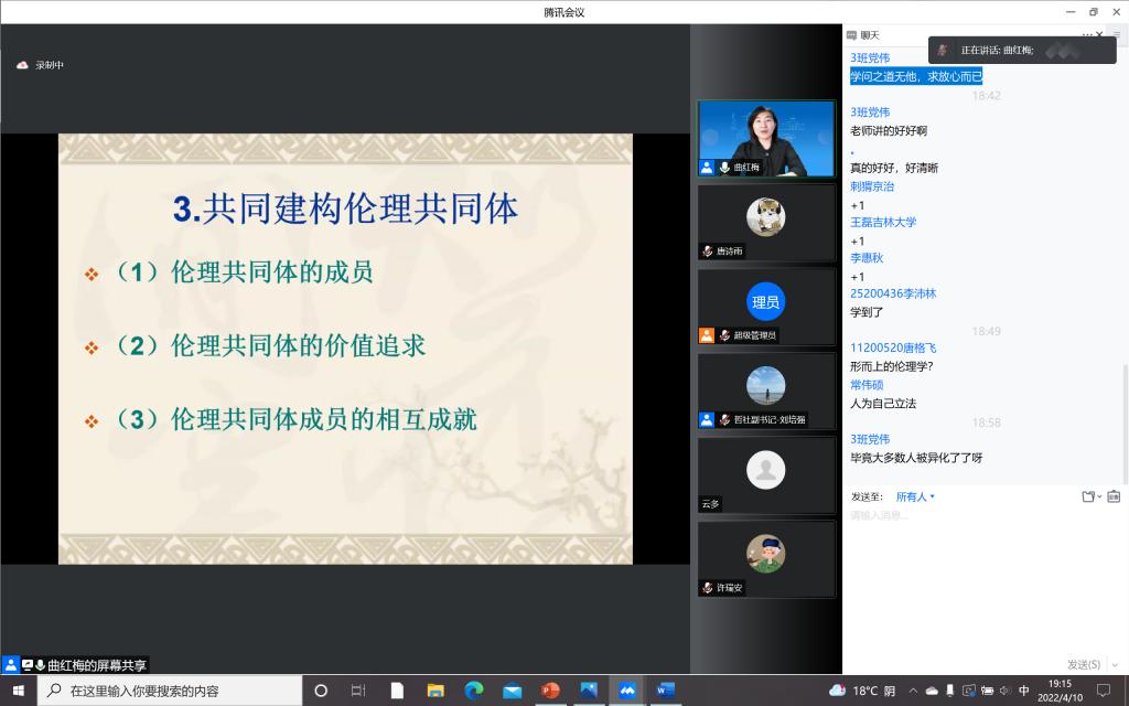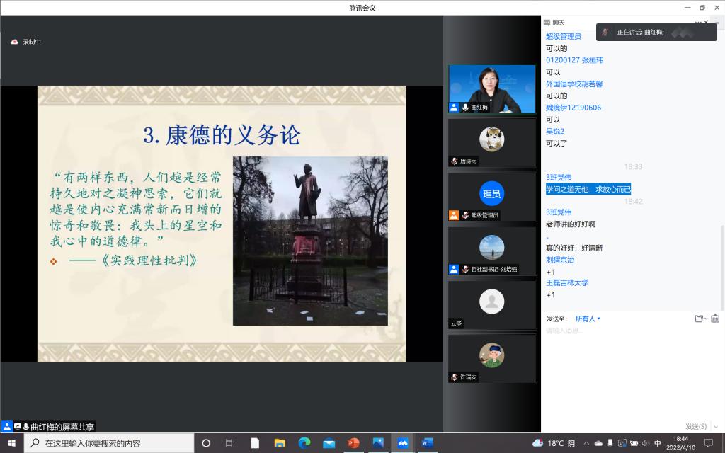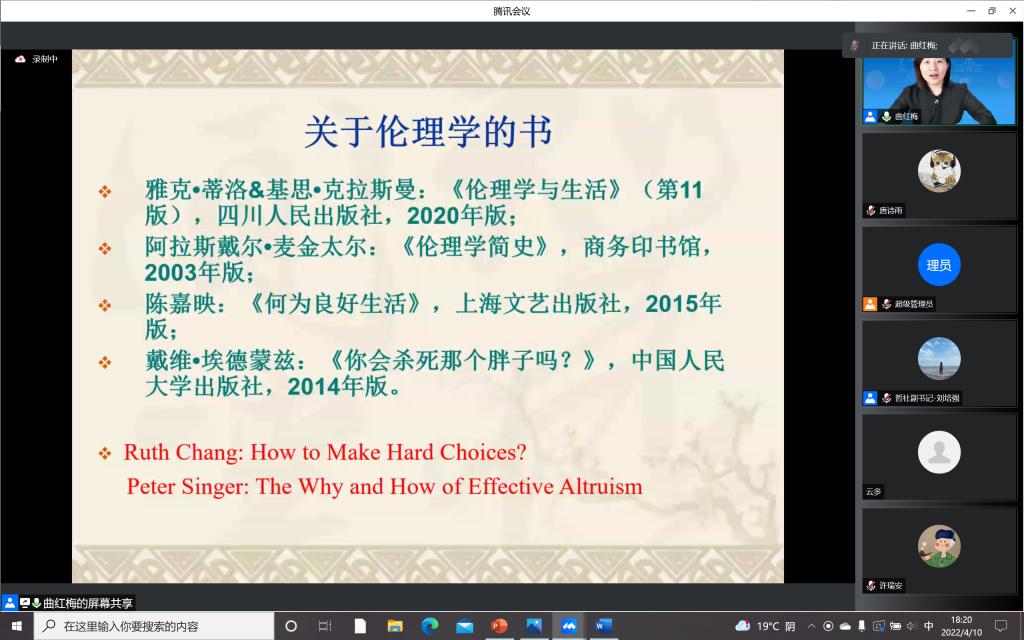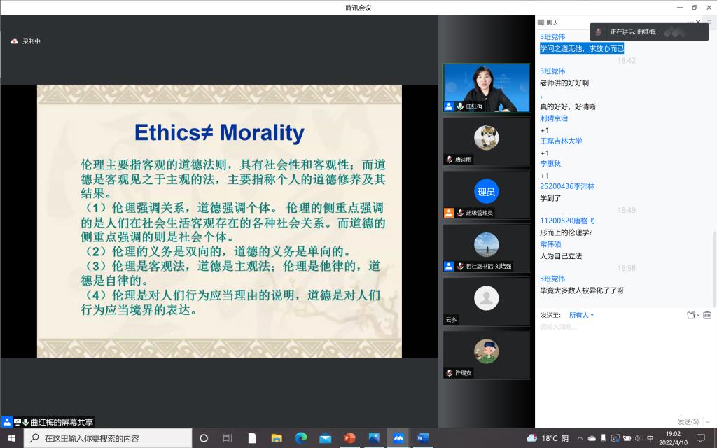 为加强疫情防控期间入党积极分子的思想教育和价值引领,提升入党积极分子的理论水平和政治素养,筑牢团结抗疫的思想阵线,必赢线路检测3003本科生党支部积极响应学校号召,组织入党积极分子同学于4月10日晚在宿舍聆听了“思想·理论·人生:100讲”疫情防控名师线上大讲堂系列巡讲第三十二讲。本次讲座请到了必赢3003no1线路检测中心哲学社会学院教授,博士生导师,国家级青年人才称号获得者曲红梅老师,分享有关“好生活与好好生活”的人生哲思。